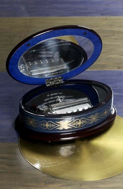 Het cadeau is een Zwitserse speeldoos uitgevoerd in blauwe (lapis lazuli-imitatie) lak met intarsia van een lichtkleurig metaal met parelmoer. Het speelwerk is een zogenaamd 3-air speelwerk met automatische melodiewisseling. Door zijdelingse verschuiving kan de muziekcilinder drie arrangementen van Mozartcomposities ten gehore brengen op een speelkam met 72 tanden. Het betreft: Glockenspiel uit Die Zauberflöte, het menuet uit Eine Kleine Nachtmusik en de Turkse Mars. De muziek van Wolfgang Amadeus Mozart (1756-1791) leent zich bij uitstek voor het speeldoos-medium.