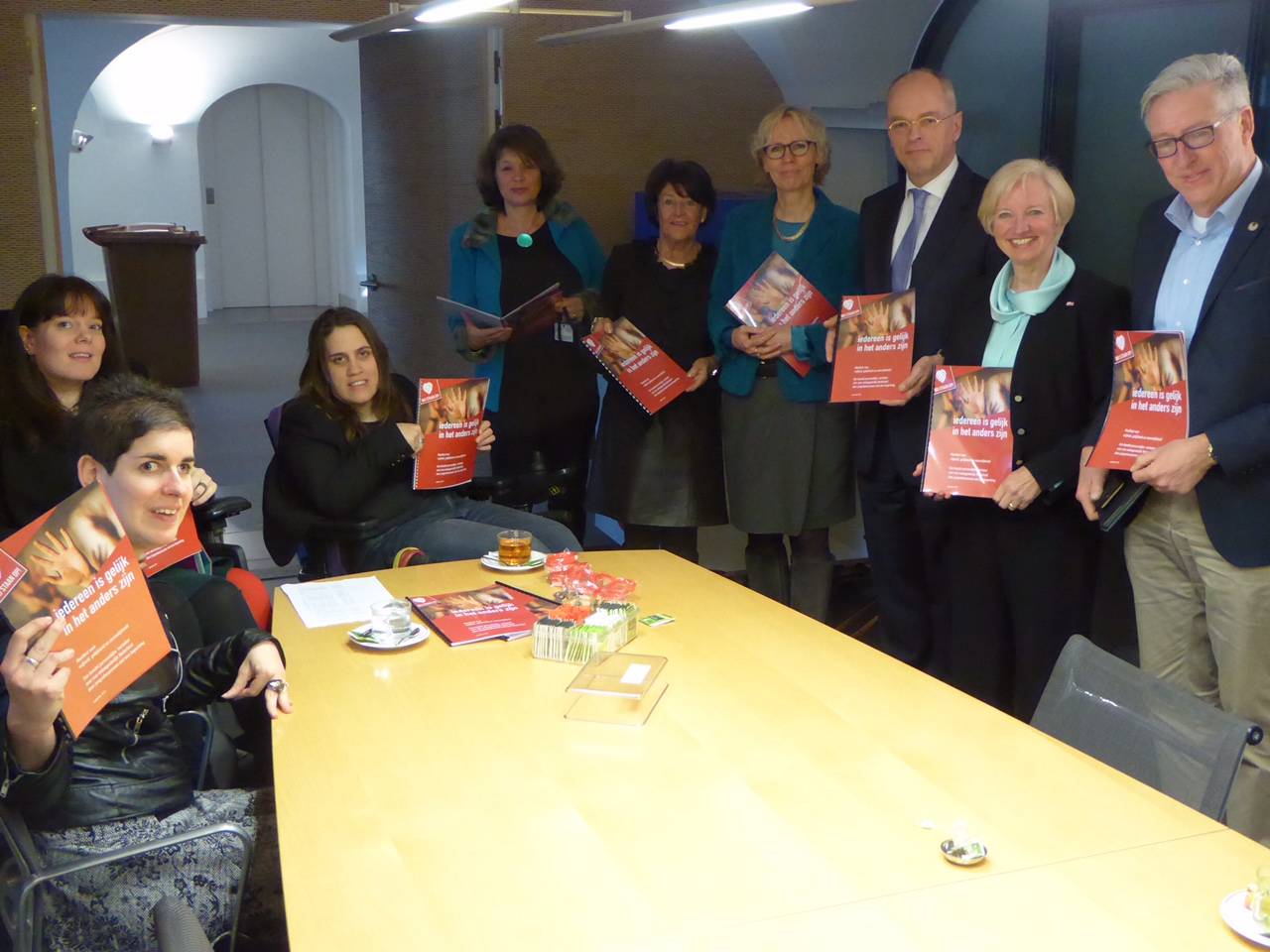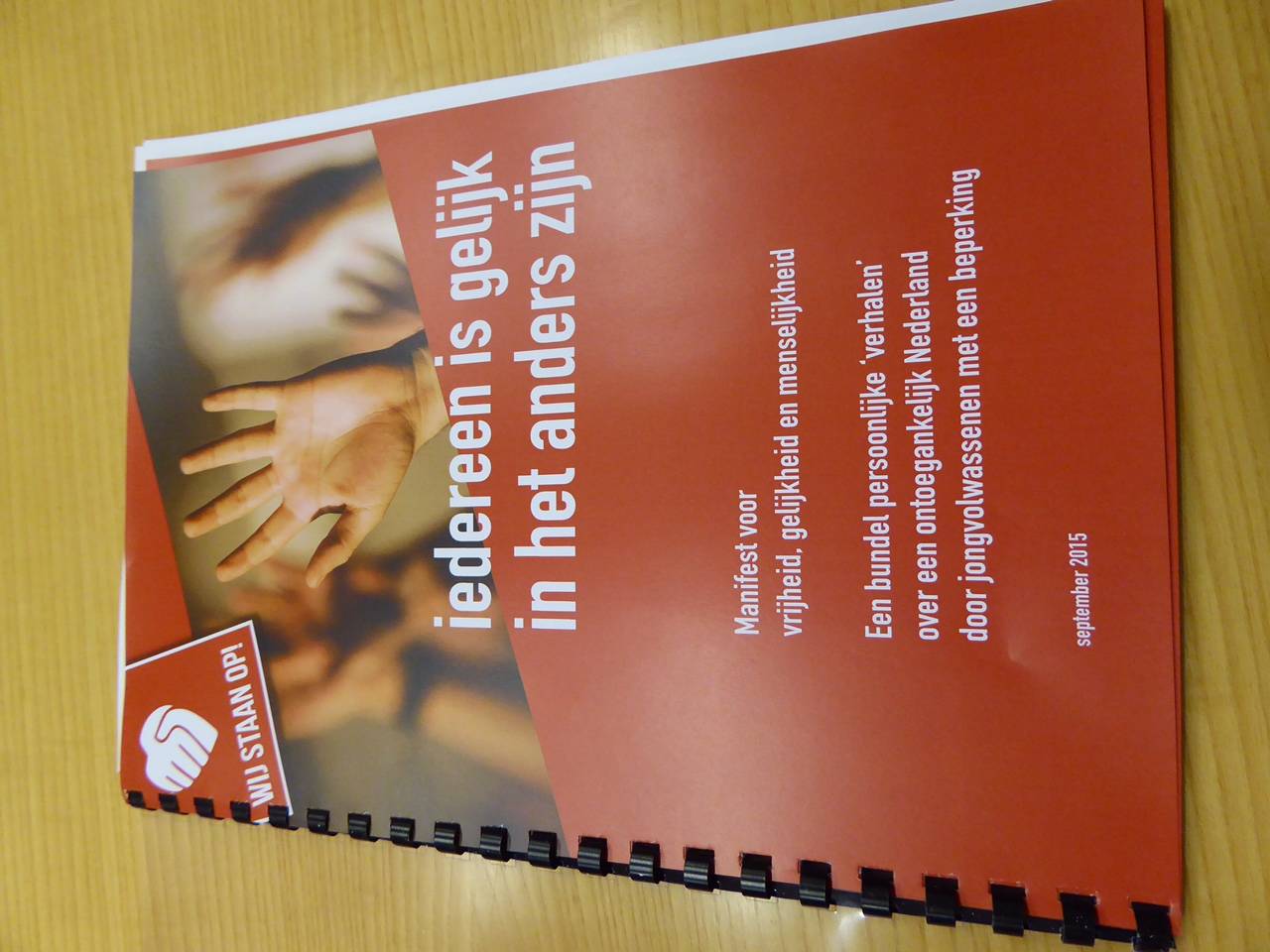 Enkele jongvolwassenen met een beperking hebben dinsdag 16 februari 2016 namens de beweging Wij staan op! een manifest met twaalf aanbevelingen aangeboden aan de vaste Kamercommissie voor Volksgezondheid, Welzijn en Sport (VWS) van de Eerste Kamer. Het doel van de beweging is een verandering in het denken, doen en laten in de Nederlandse maatschappij teweeg te brengen. Het Manifest voor vrijheid, gelijkheid en menselijkheid werd in aanwezigheid van een aantal commissieleden in ontvangst genomen door voorzitter Maria Martens van de commissie. De Eerste Kamer heeft momenteel de wetsvoorstellen goedkeuring en uitvoering van het VN-verdrag inzake de rechten van personen met een handicap (33992 en 33990) in behandeling. De Tweede Kamer heeft de wetsvoorstellen op 21 januari 2016 aanvaard.