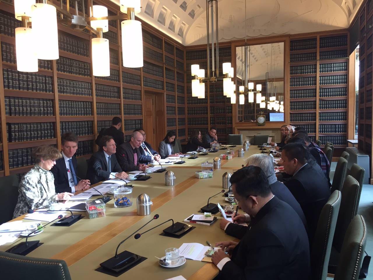 De delegatie werd verwelkomd door de Tweede Ondervoorzitter van de Eerste Kamer, Joris Backer, alsook door de eerste plaatsvervangend griffier, Luuk van Luijk, en de griffier van de commissie Financiën, Kim van Dooren. Naast de genoemde gespreksonderwerpen was de delegatie ook zeer geïnteresseerd in de samenstelling en werkwijze van de Eerste Kamer. Na afloop van het gesprek had de delegatie een korte rondleiding in de plenaire zaal.
