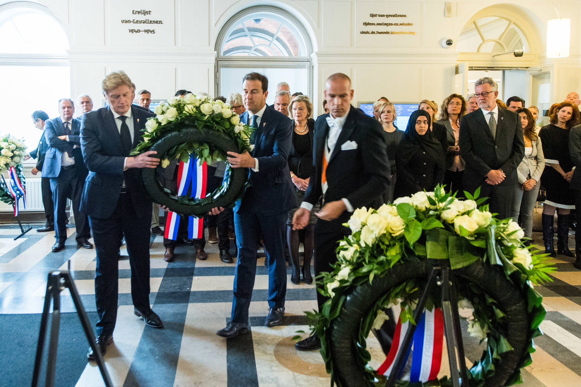Vervolgens legden de Voorzitters van de Eerste en Tweede Kamer, Ankie Broekers-Knol en Khadija Arib, een krans namens de Staten-Generaal, gevolgd door Vice-premier Lodewijk Asscher en Staatssecretaris Martin Van Rijn van Volksgezondheid, Welzijn en Sport namens de Ministerraad van het Koninkrijk, en de rector en een leerling van de Johan de Witscholengroep namens hun school.