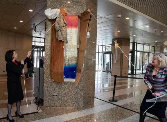 De Voorzitter van de Tweede Kamer Khadija Arib en de Voorzitter van de Eerste Kamer Ankie Broekers-Knol hebben donderdag in de Statenpassage van de Tweede Kamer een kunstwerk onthuld dat de Staatkundig Gereformeerde Partij (SGP) ter gelegenheid van haar 100-jarig bestaan aan de Staten-Generaal heeft geschonken. Dat gebeurde in aanwezigheid van onder meer de SGP-fractievoorzitter in de Tweede Kamer Kees van der Staaij, de SGP-fractievoorzitter in de Eerste Kamer Peter Schalk en SGP-partijvoorzitter Maarten van Leeuwen. Een gelegenheidskoor zong drie coupletten uit het Wilhelmus.