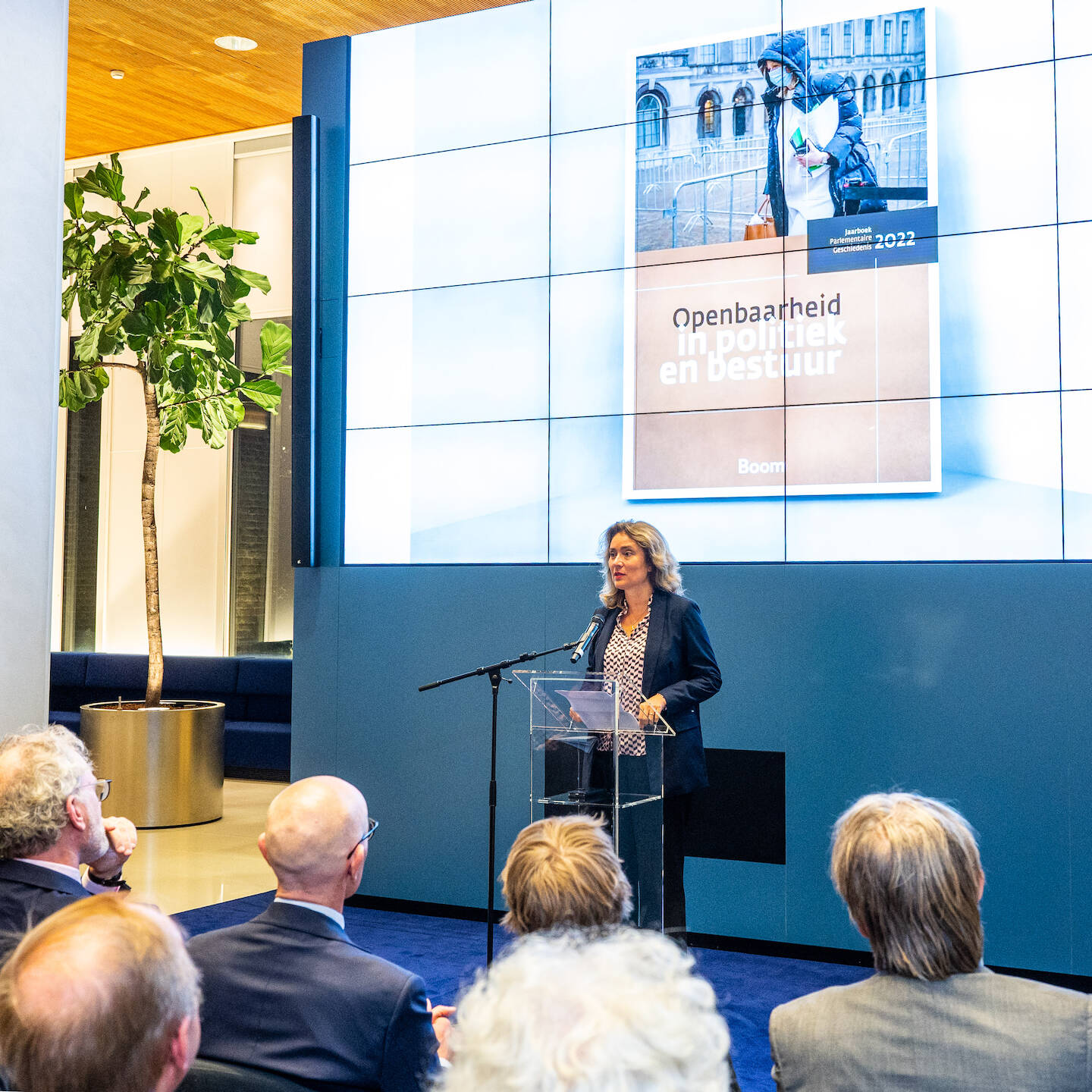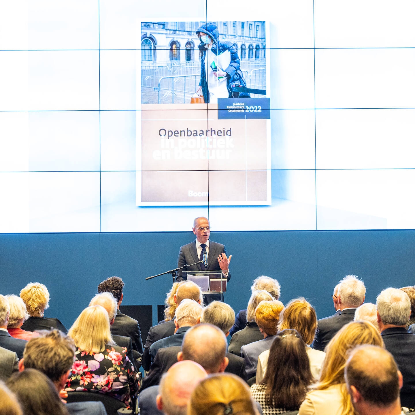 Eerste Kamervoorzitter Jan Anthonie Bruijn ging tijdens de aanbieding van het Jaarboek kort in op de Wet open overheid (Woo) die op 1 mei 2022 in werking is getreden. Het doel van de Wet open overheid is dat meer overheidsinformatie openbaar wordt gemaakt. Ook de informatie van het parlement, de Eerste Kamer en Tweede Kamer, valt onder de Wet open overheid. Dat is een verandering ten opzichte van de vorige wet, de Wet openbaarheid van bestuur. Bruijn: “Ik kan natuurlijk alleen voor de Eerste Kamer spreken, maar de verdere openstelling van de besluitvorming bij politiek en bestuur én de actieve openbaarmaking dragen zeker bij aan grotere transparantie.”