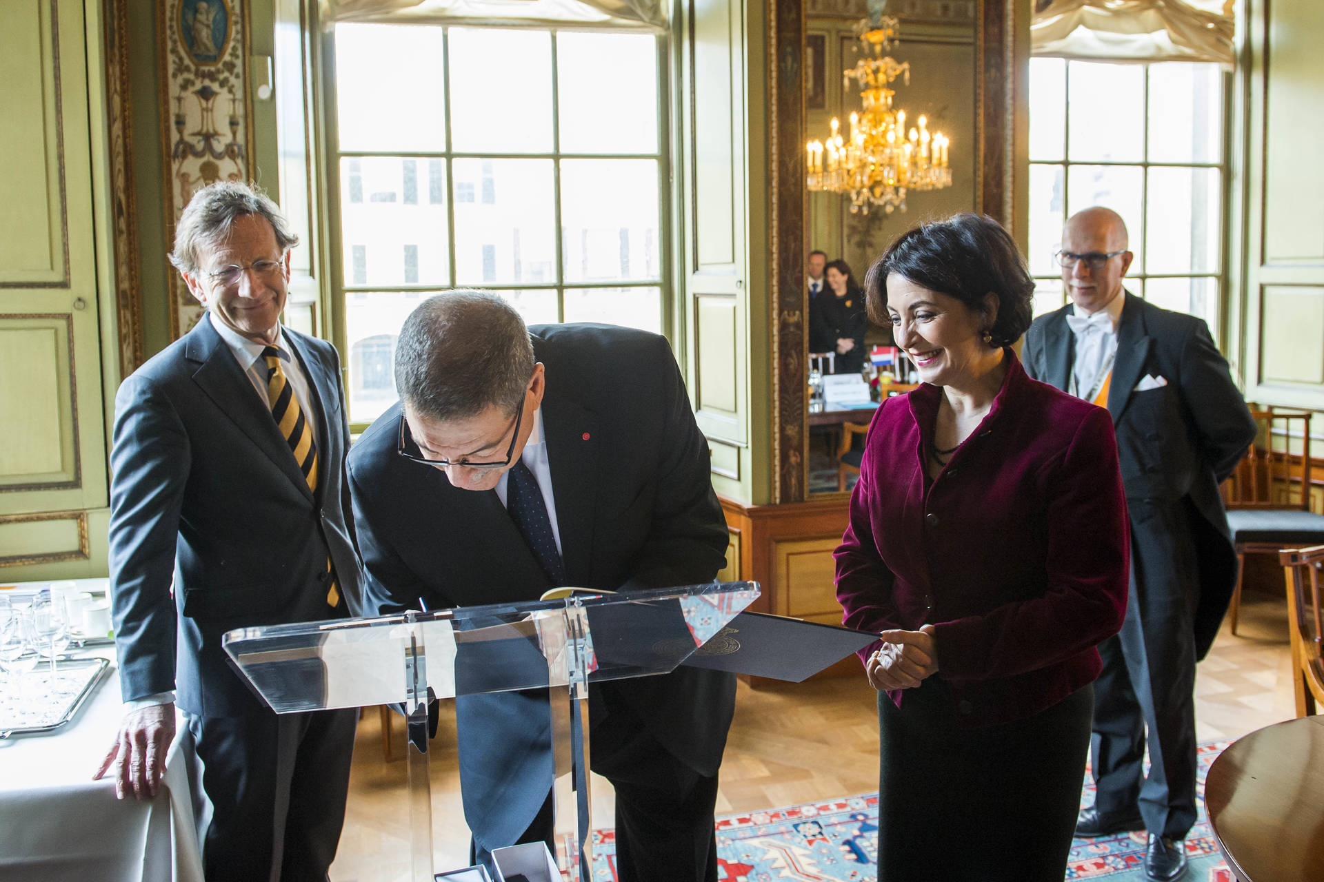 De Tunesische premier nam eerder deze week deel aan een ceremoniële bijeenkomst in de Grote Zaal van het Vredespaleis in Den Haag voor de Tunesische winnaars van de Nobelprijs voor de Vrede in 2015. Vertegenwoordigers van vier maatschappelijke organisaties in Tunesië kregen die prijs voor hun inspanningen voor het democratiseringsproces in dat land. Drie van de vier organisaties waren ook in het Vredespaleis vertegenwoordigd, evenals vertegenwoordigers van de Staten-Generaal. Ook Ondervoorzitter Backer was bij deze bijzondere bijeenkomst aanwezig.