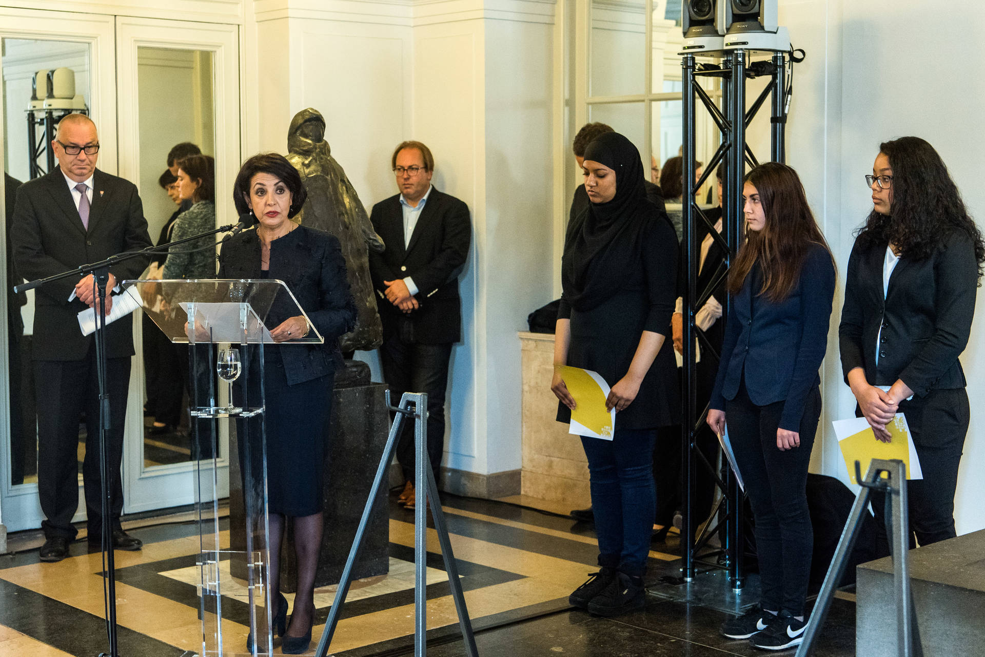 Tijdens de plechtigheid droegen leerlingen van de Haagse Johan de Wittscholengroep zelfgeschreven gedichten voor. Daarna sprak Tweede Kamervoorzitter Khadija Arib over ''het doorgeven van de vrijheid''. Ze wees erop ''dat democratie even mooi als broos is'', en dat het van levensbelang is ''onze waarden uit te dragen in woord en daad''.